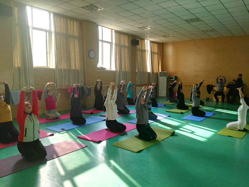 教职工们在专业瑜伽教练的引领下,伴随着优美舒缓的旋律,在瑜伽教练温柔和缓的指令下渐渐进入瑜伽调息阶段。吸气、呼气、伸展、扭转,随着一招一式,一呼一吸,大家内心的繁杂和压力都融化在这静谧的空气中。大家在教练的授意下盘腿而坐,双手合十,把烦恼和忧愁放下,全身心投入到瑜伽训练中,充分享受着瑜伽的最高境界即心灵的宁静。八十分钟的训练坚持下来虽然有点累,但大家在瑜伽的世界里缓解了身心的疲惫,感受到简单的轻松与快乐。